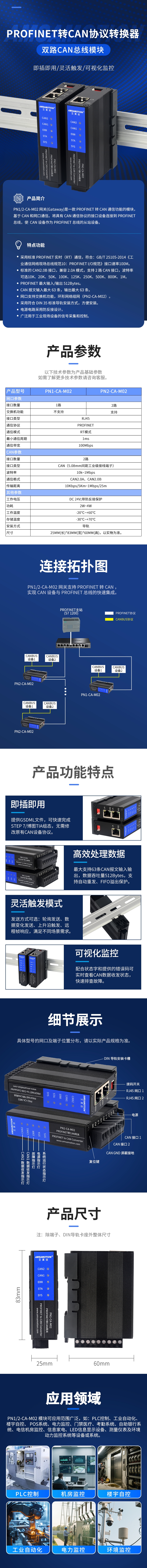 PN1/2-CA-M02 为 CAN 转 PROFINET 工业网关,搭载双路 CAN2.0B 接口,支持 PROFINET 实时通讯。单 / 双网口型号可选,适配环形组网,工业宽压供电,导轨式安装。无需编程,依托组态即可实现 CAN 设备接入西门子 PLC 系统,兼容多类波特率,满足工业现场协议转换与设备联网需求。
